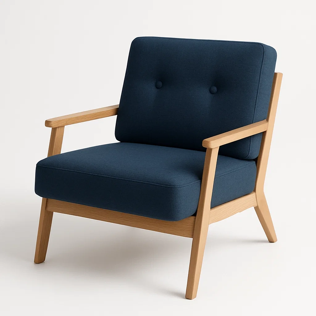 Poltrona in poliestere blu scuro con telaio in legno di quercia